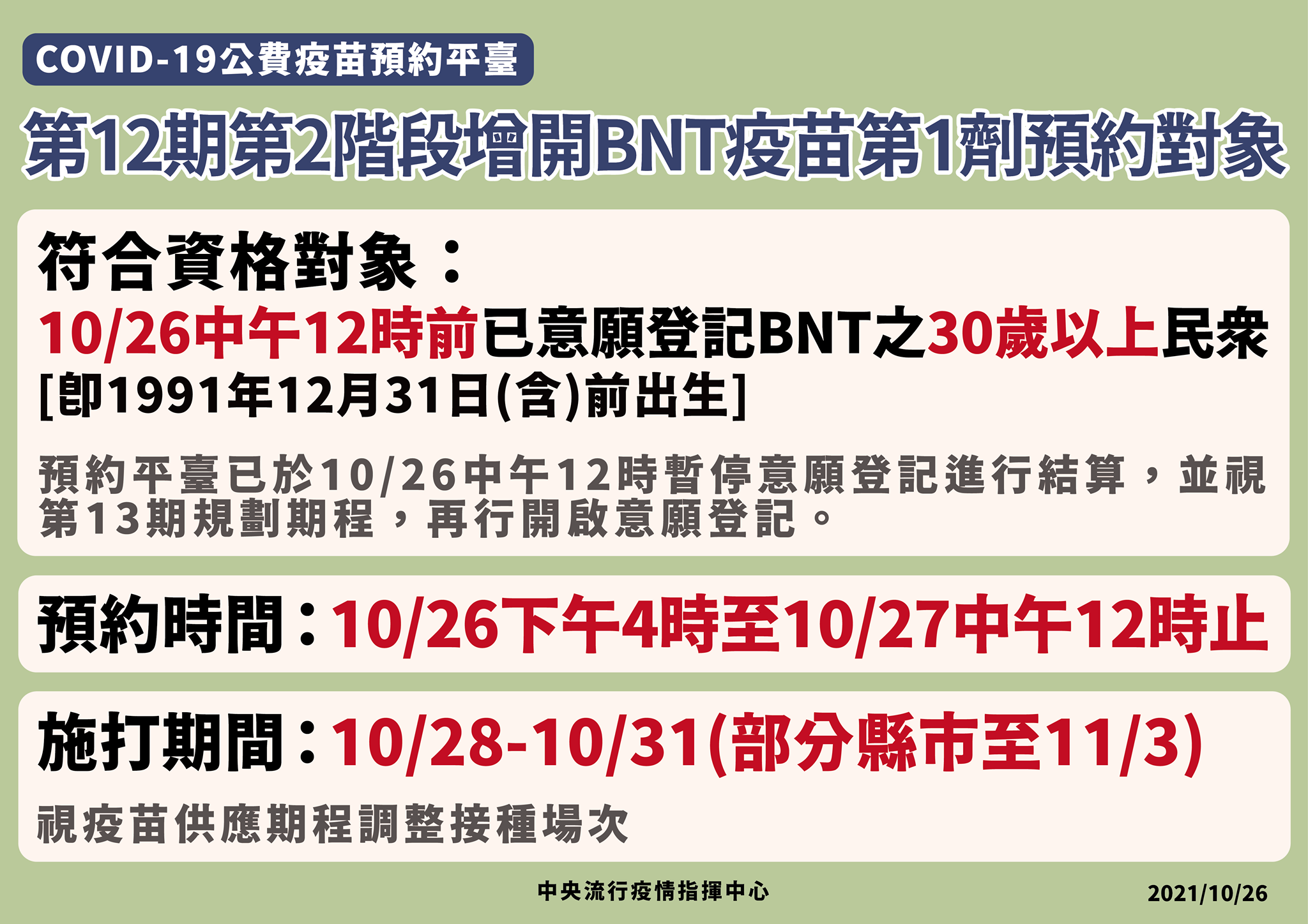 中央流行疫情指揮中心今(26)日表示,為利疫苗資源有效利用,「COVID-19公費疫苗預約平臺」(https://1922.gov.tw/,以下簡稱預約平臺)第12期第2階段將增加開放「10月26日中午12時前意願登記BNT疫苗之30歲以上民眾[即1991年12月31日(含)前出生]」,預約接種第一劑。預約時程:10月26日下午4時至10月27日中午12時止;施打時程:10月28日至10月31日(部分縣市至11月3日)。