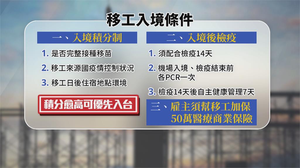 台灣從今年(2021年)4月底~9月底,出現2.3萬多的移工缺口,如今疫情趨緩,勞動部表示,最快在11月中下旬,重啟移工入境,並將採取積分制,包含移工是否完整接種移苗,來台3天前要PCR檢測陰性證明,入境後隔離則要14+7天,並且一人一室。