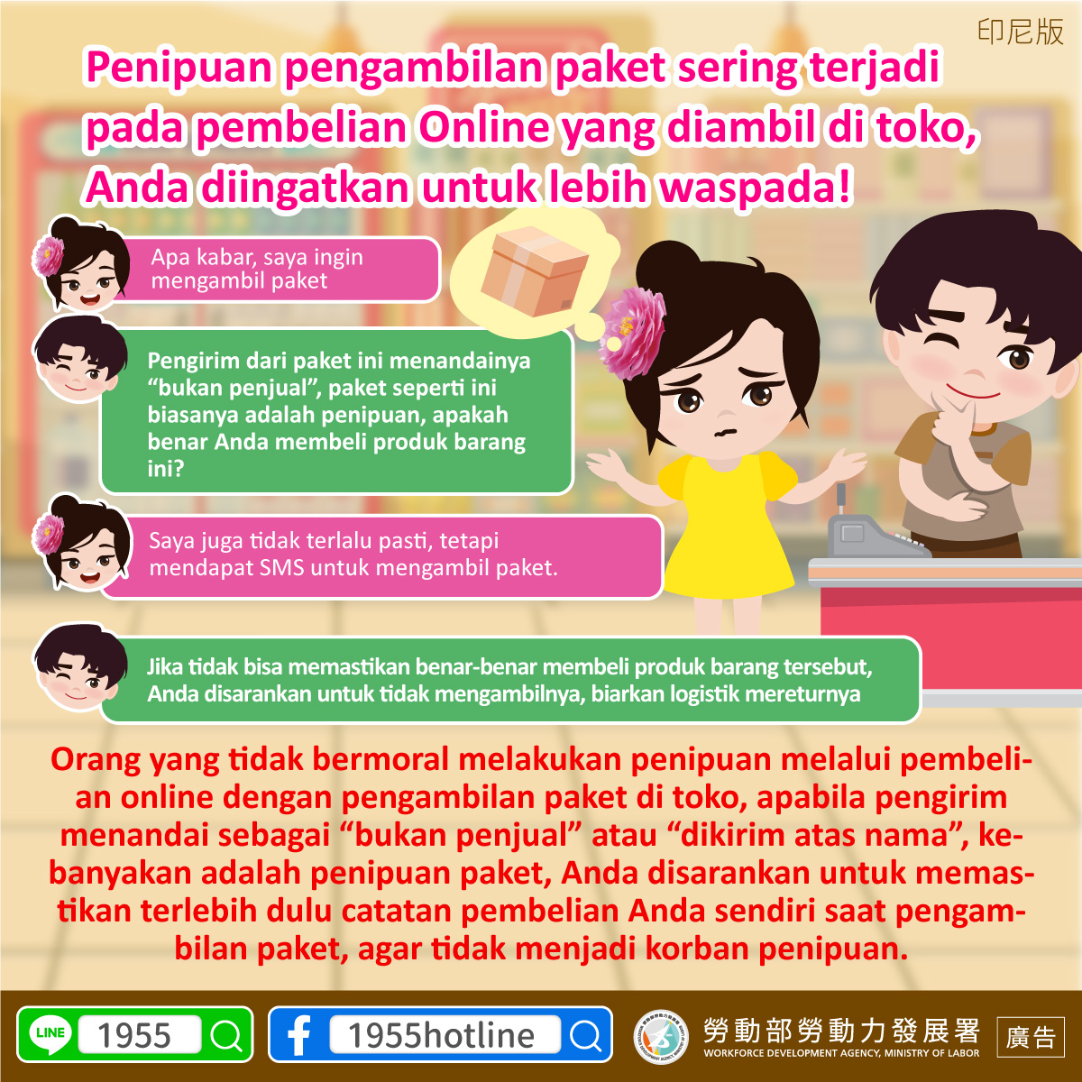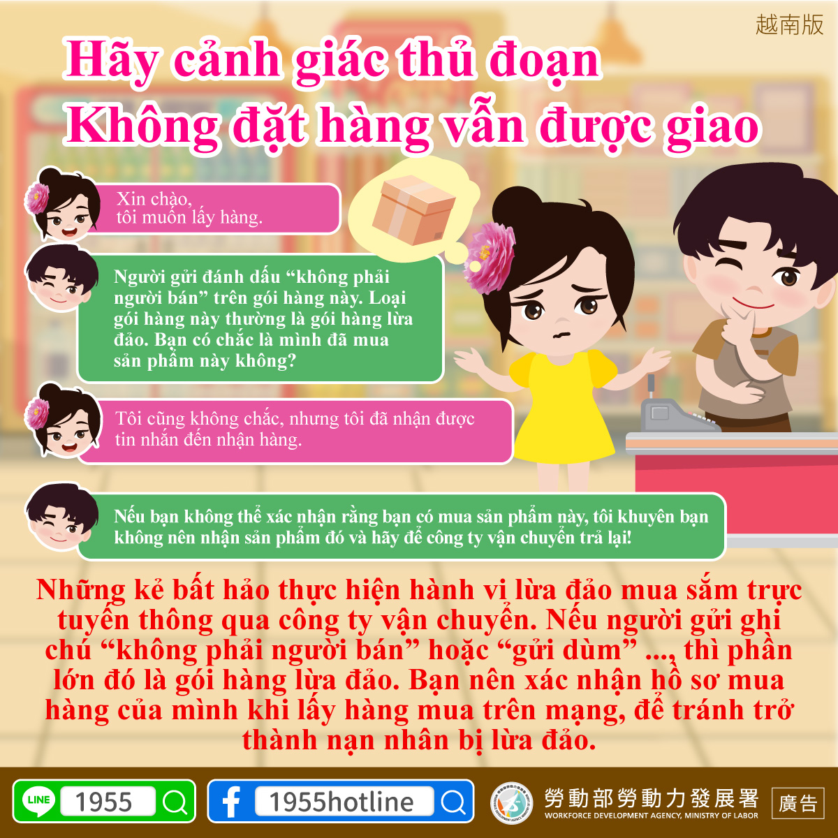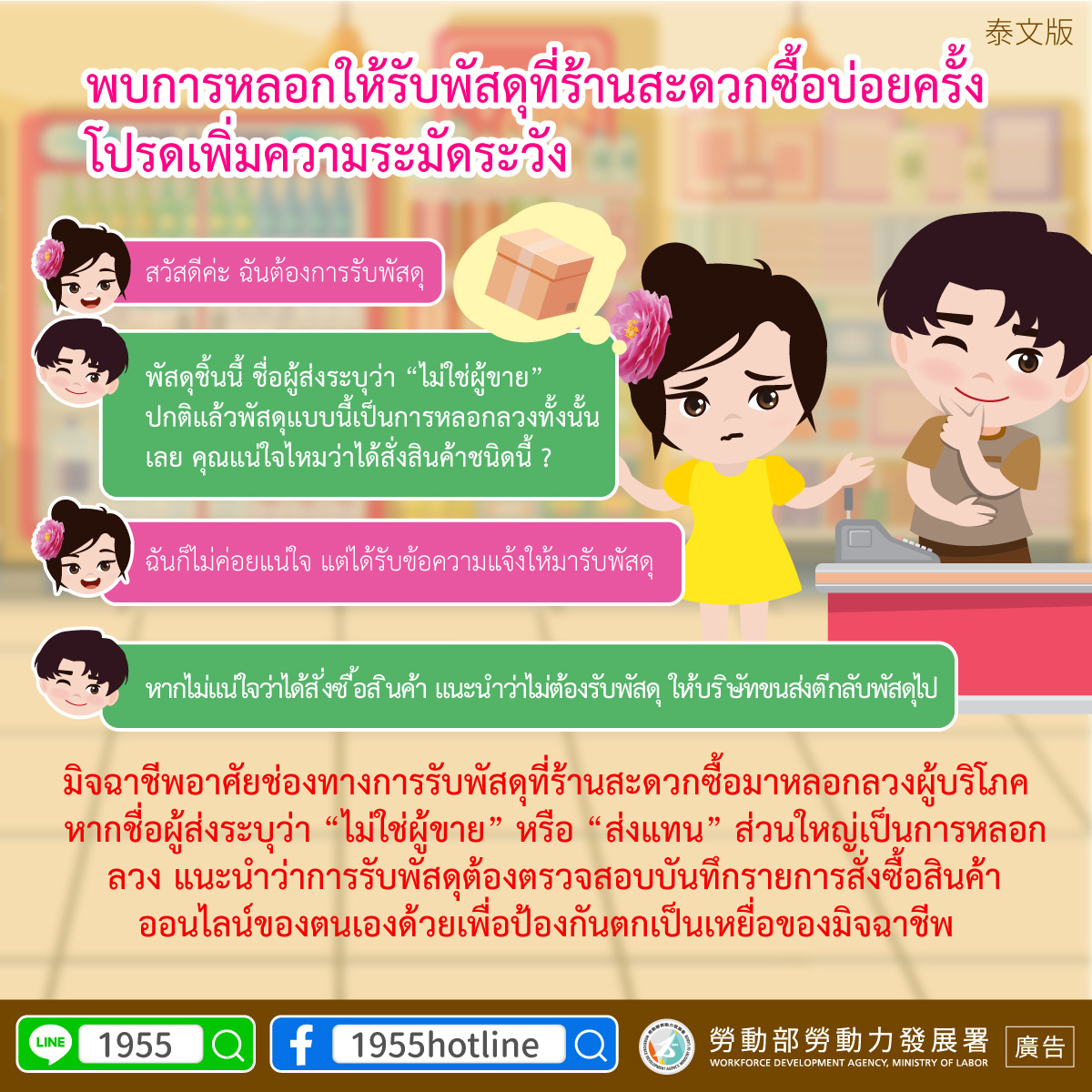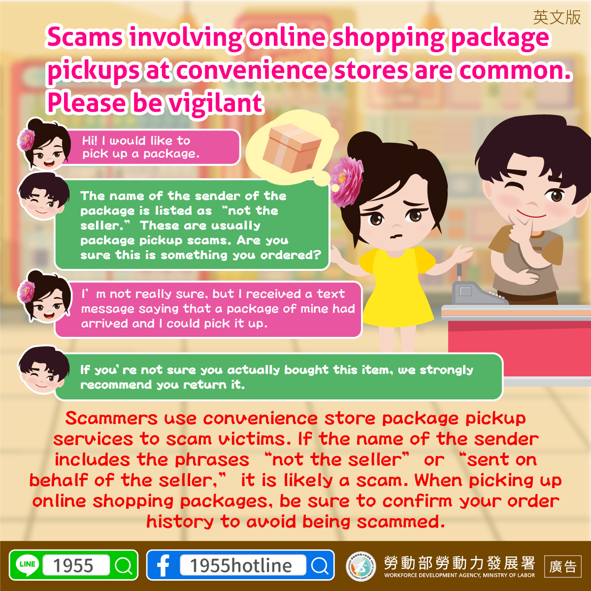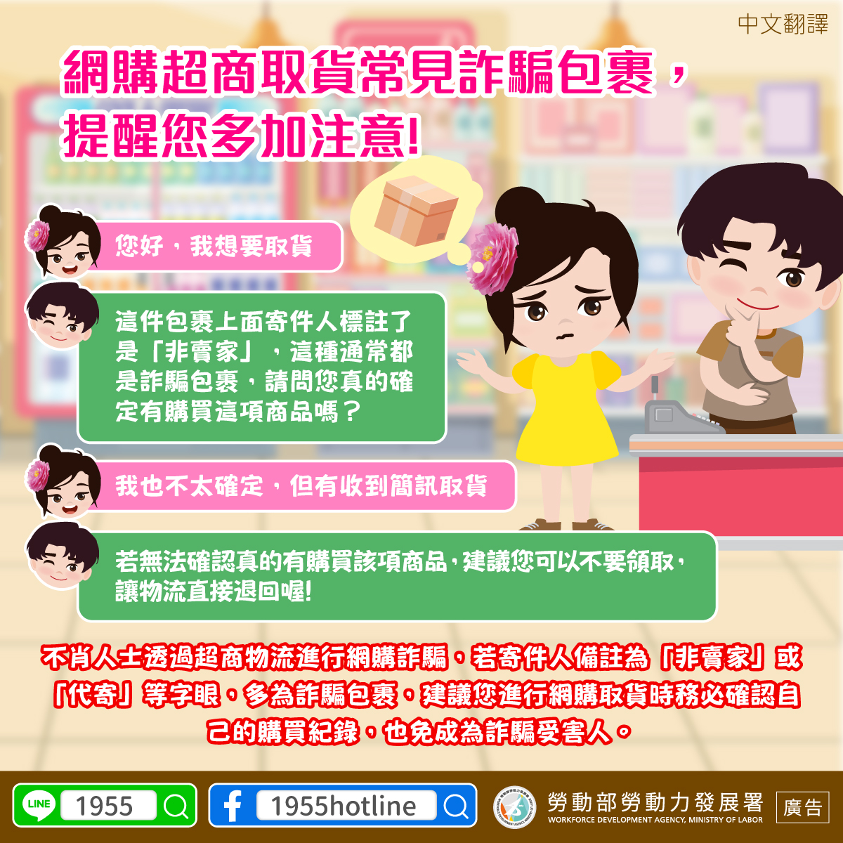 不肖人士透過超商物流進行網購詐騙,若寄件人 備註為「非賣家」或「代寄」等字眼,多為詐騙 包裹,建議您進行網購取貨時務必確認自己的購 買紀錄,也免成為詐騙受害人。