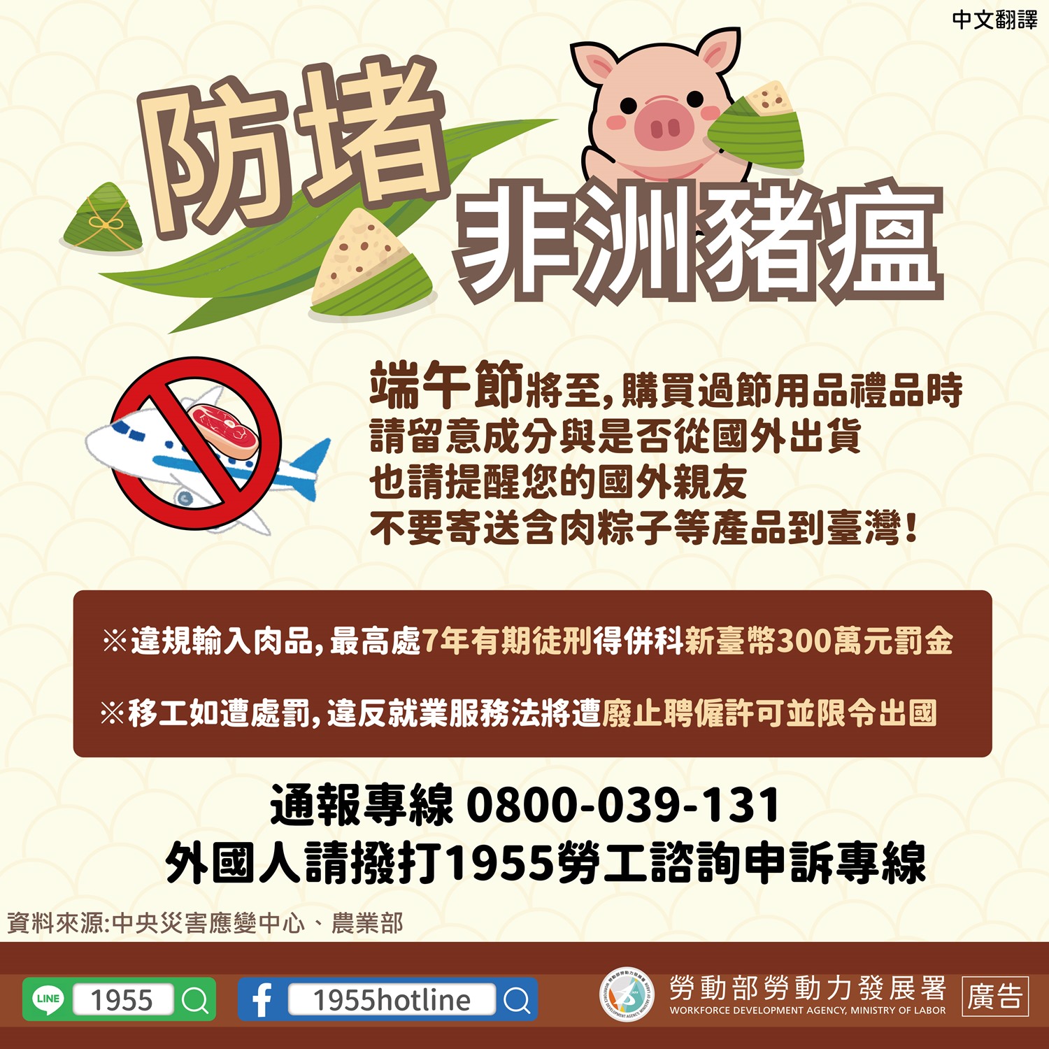 端午節將至,購買過節用品禮品時 請留意成分與是否從國外出貨 也請提醒您的國外親友 不要寄送含肉粽子等產品到臺灣! ※違規輸入肉品,最高處7年有期徒刑得併科新臺幣300萬元罰金 ※移工如遭處罰,違反就業服務法將遭廢止聘僱許可並限令出國 通報專線 0800-039-131 外國人請撥打1955勞工諮詢申訴專線 【分享文章來源 2024/6/5 勞動力發展署】