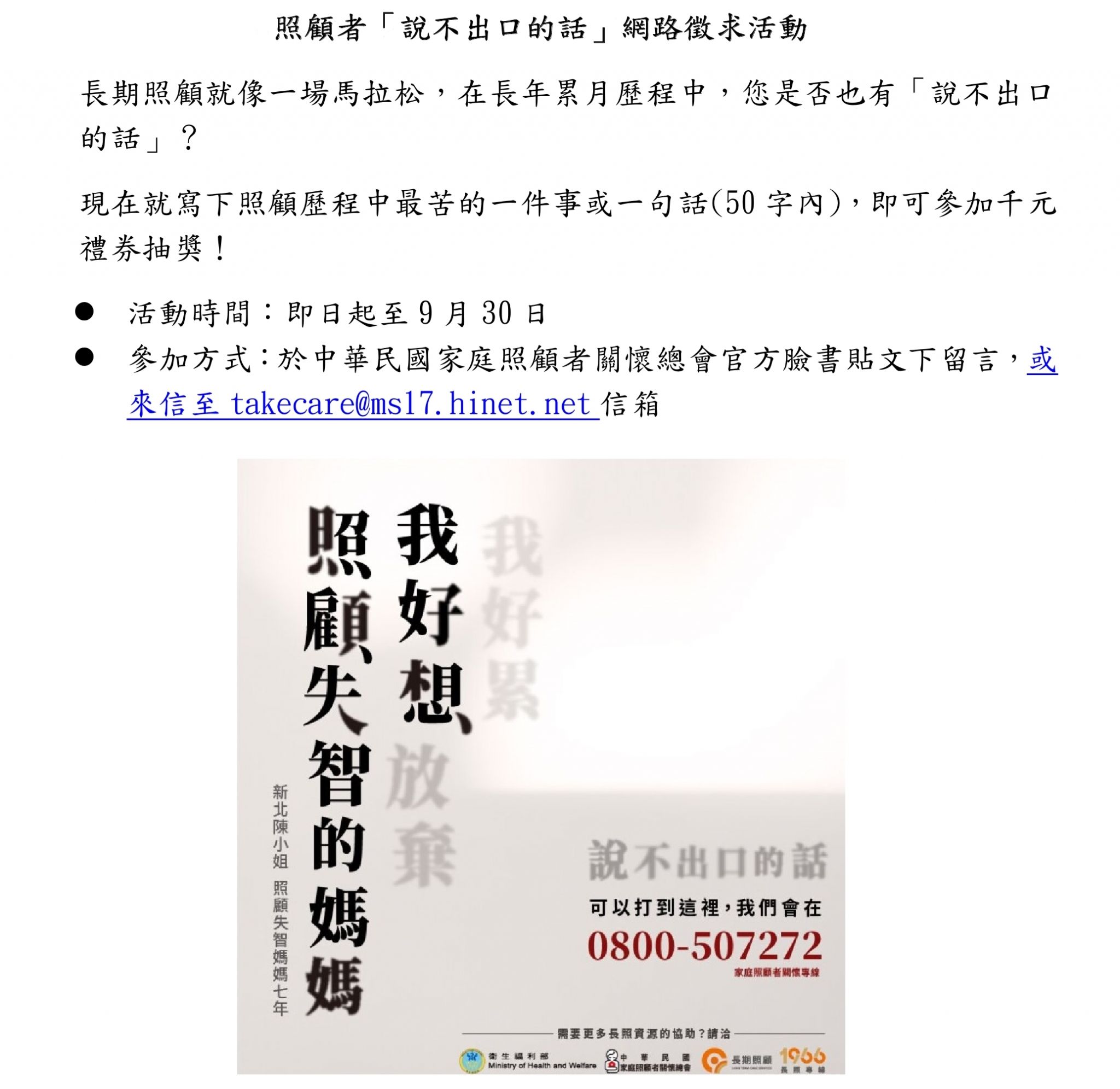 家庭照顧者的照顧樣態多元,但在家庭照顧者支持服務據點等專業人員協助下,多可運用長照資源選擇適合自己家庭的照顧安排。民眾如有任何長照需求或照顧壓力與安排問題,歡迎撥打0800-507272家庭照顧者關懷專線或1966長照專線,專線人員將提供專業協助。相關服務資訊亦可上1966 衛福部長照專區網站 查詢。即日起至9月30日,配合「打不出的那通電話」廣告片將舉辦線上徵求活動,民眾以50字內寫下照顧歷程中「說不出口」一句話,即可參加抽獎。