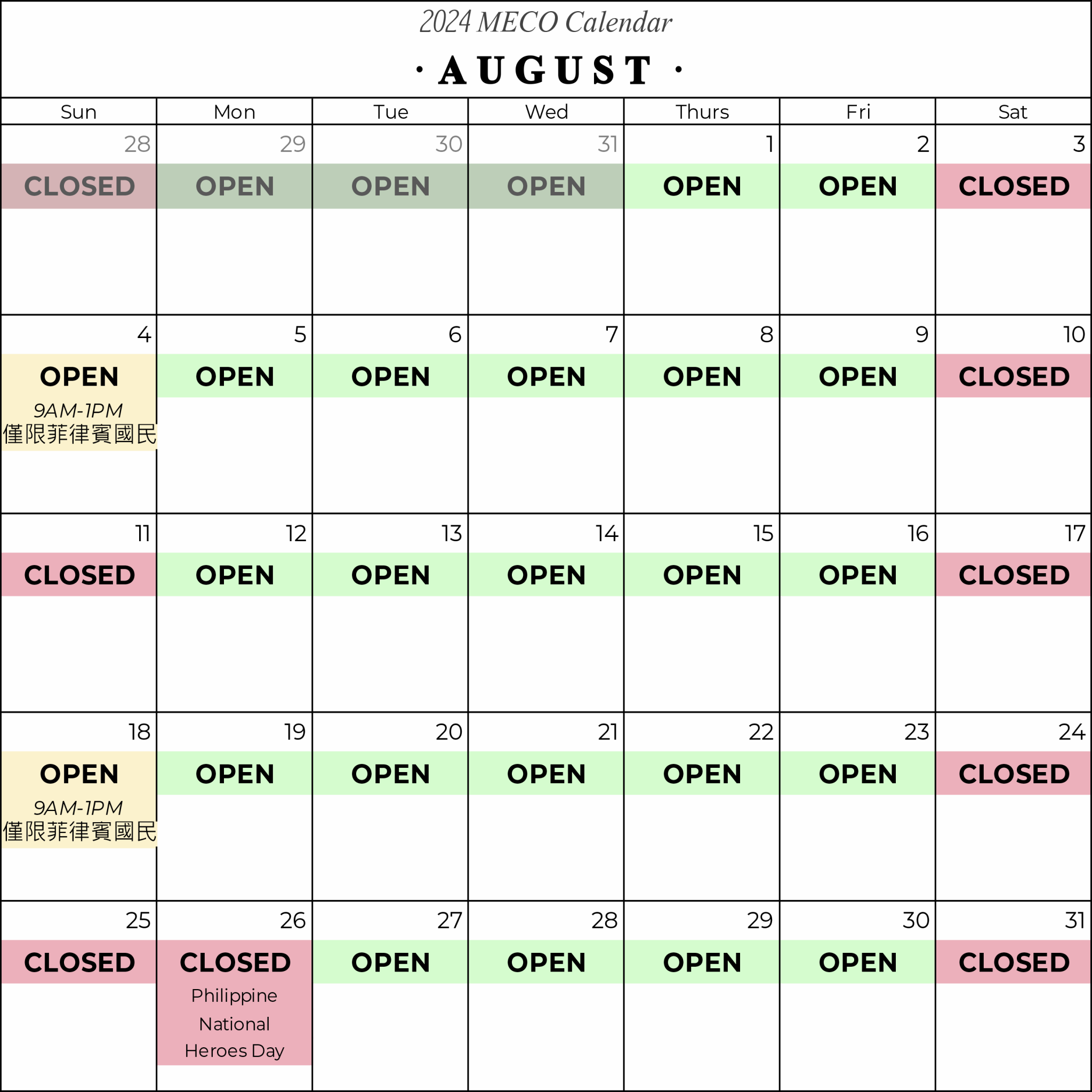 菲辦MECO公告8月休假及週日服務行事曆