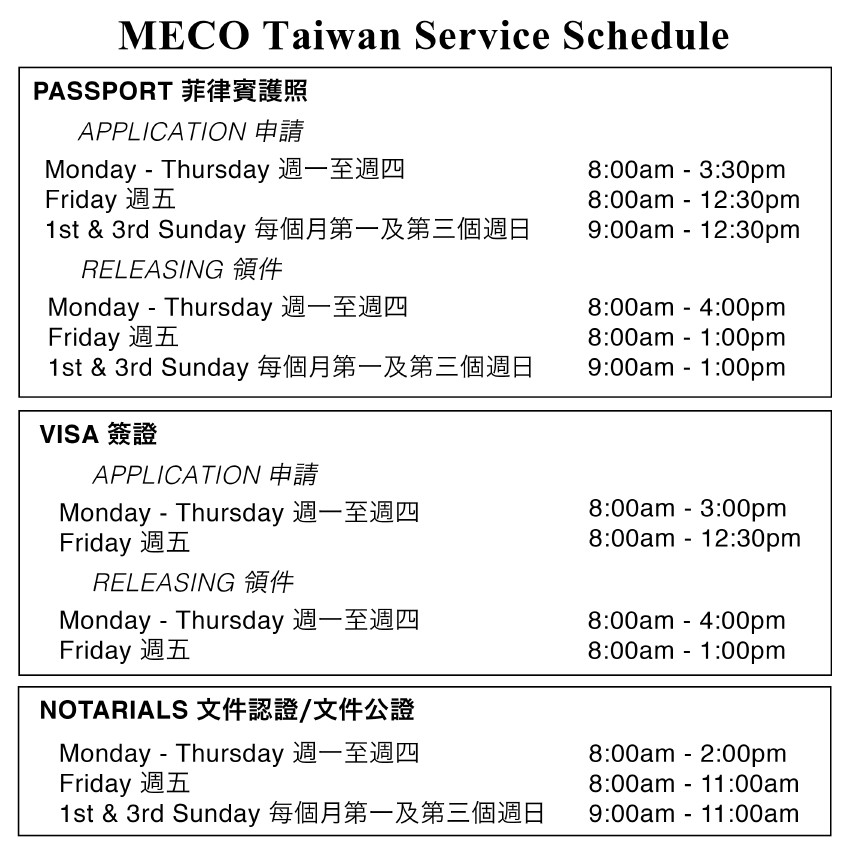 週日服務(Sunday Service)於8月4日、8月18日提供菲律賓國民自行洽辦相關業務。