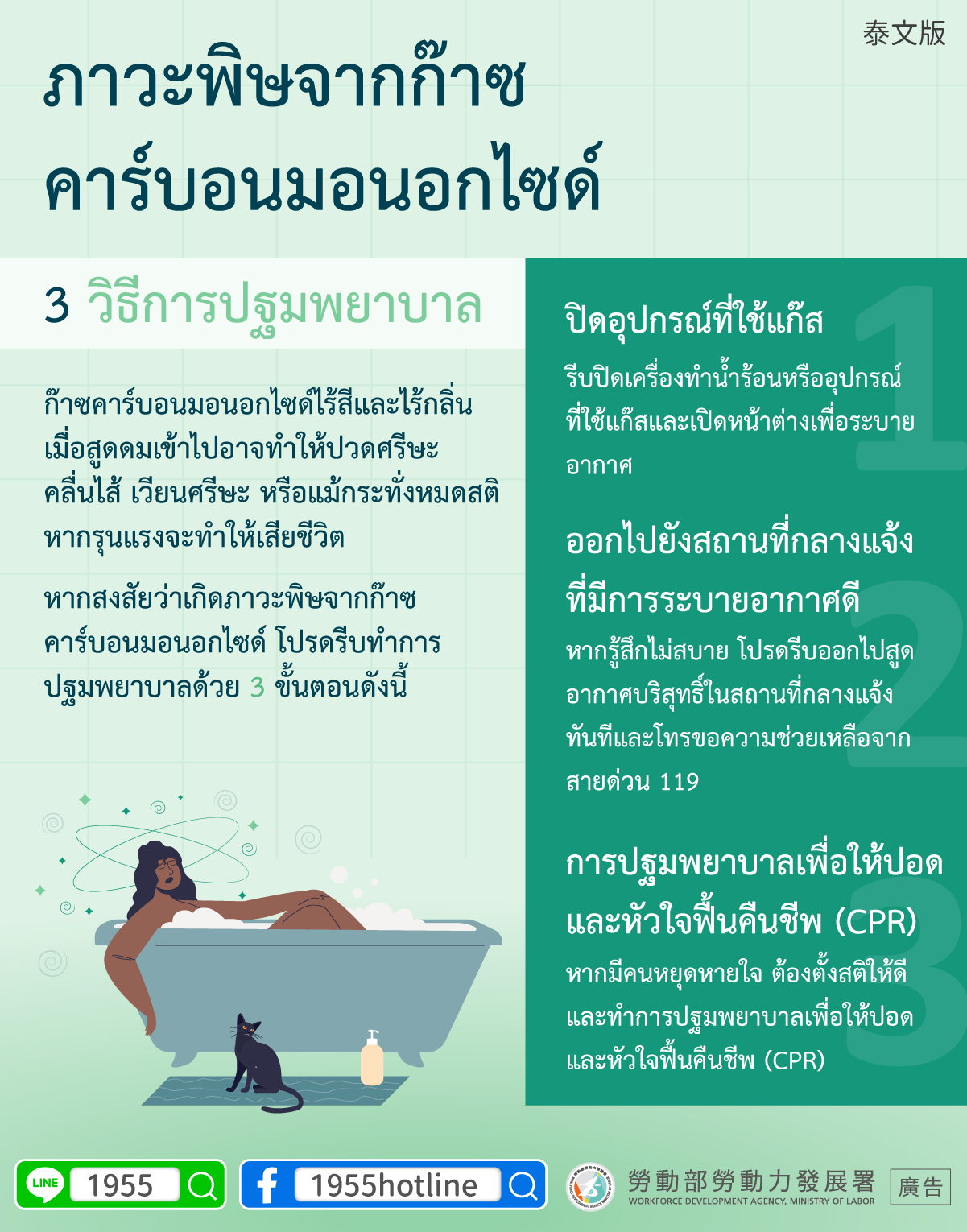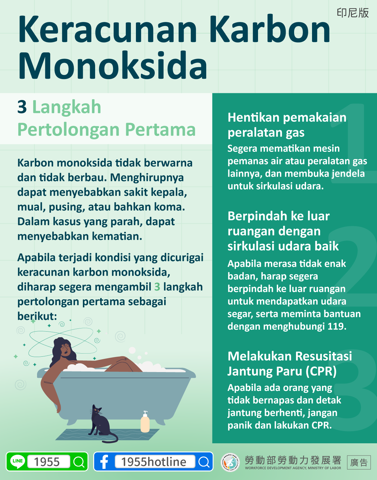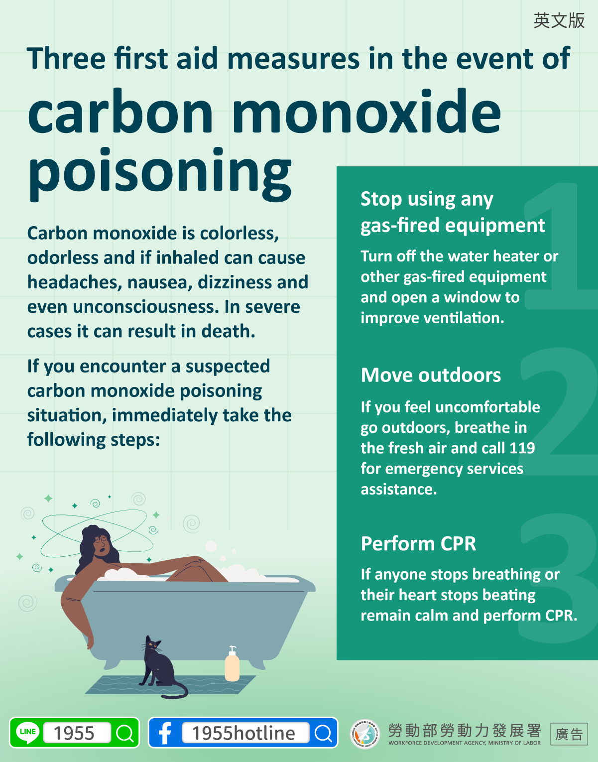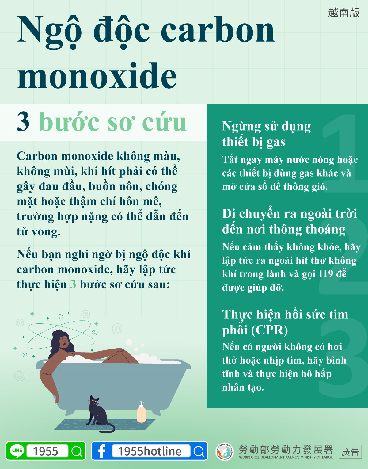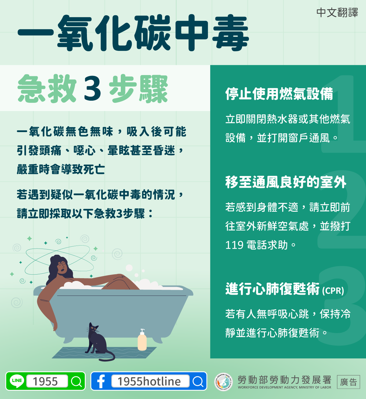 一氧化碳無色無味,吸入後可能引發頭痛、噁心、暈眩甚至昏迷,嚴重時會導致死亡;若遇到疑似一氧化碳中毒的情況,請立即採取以下急救3步驟: