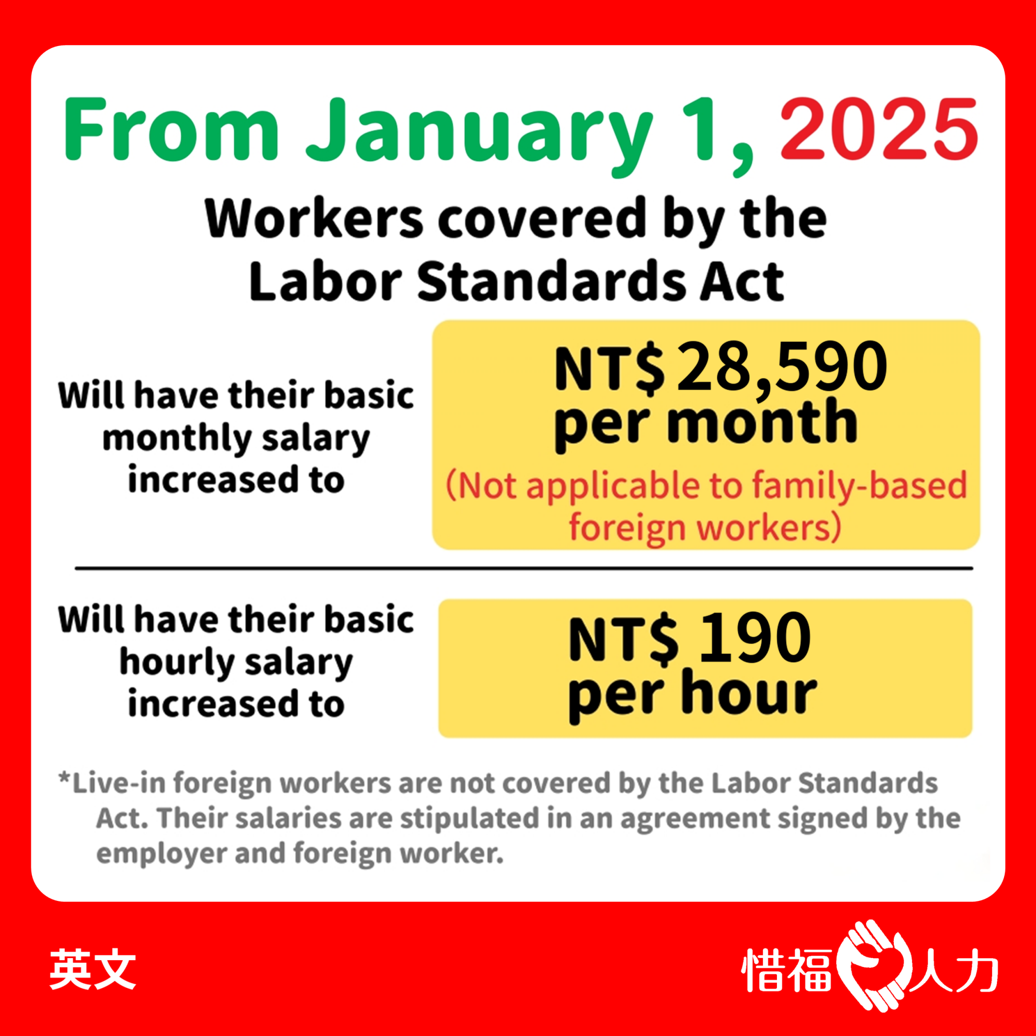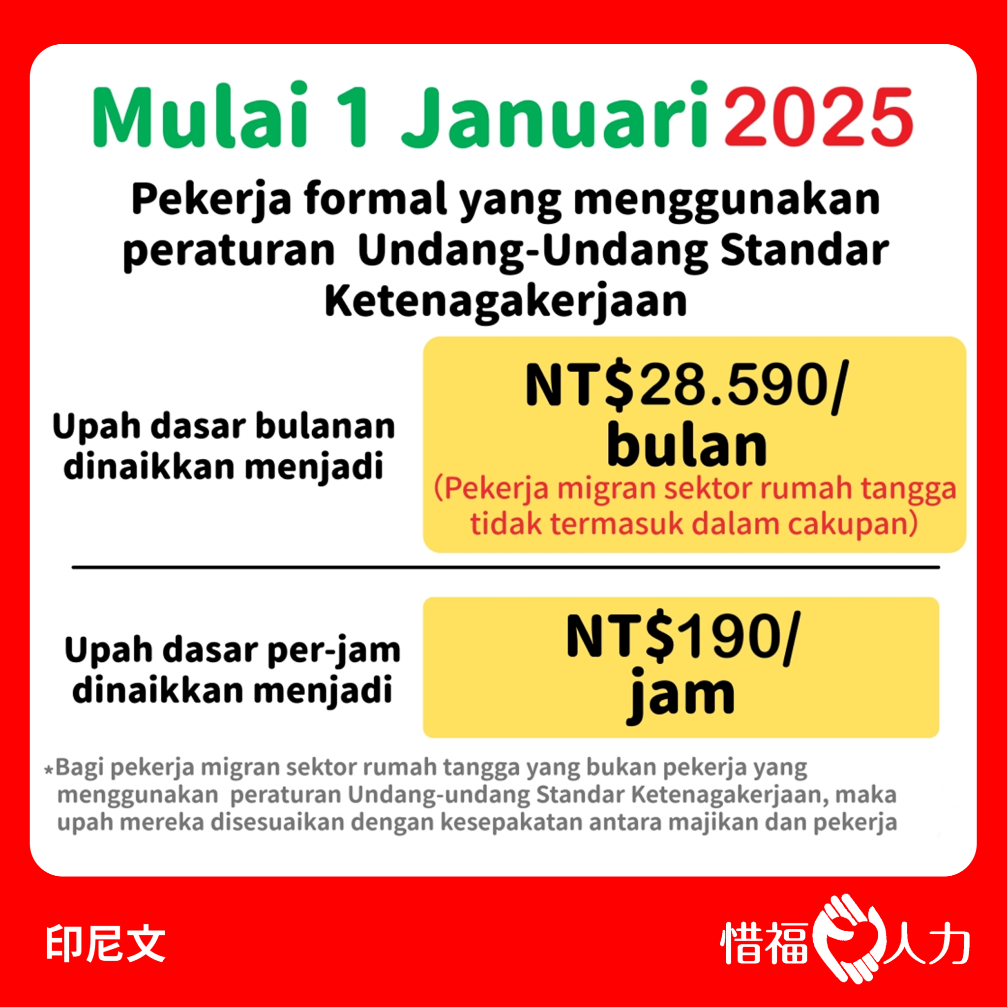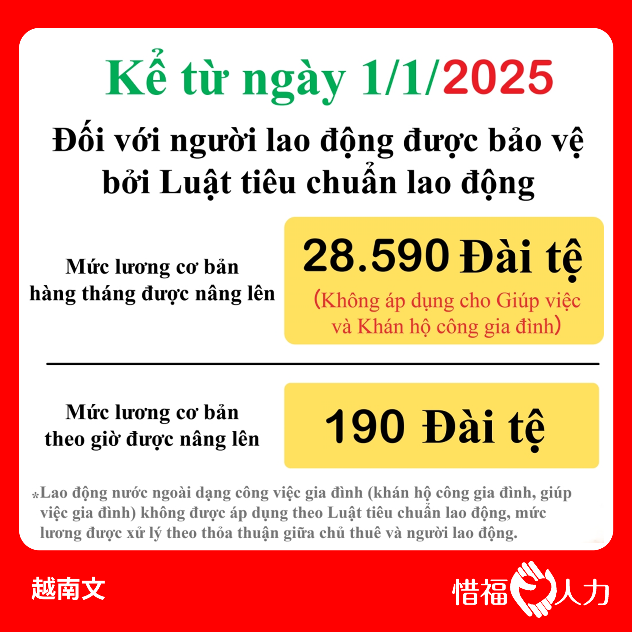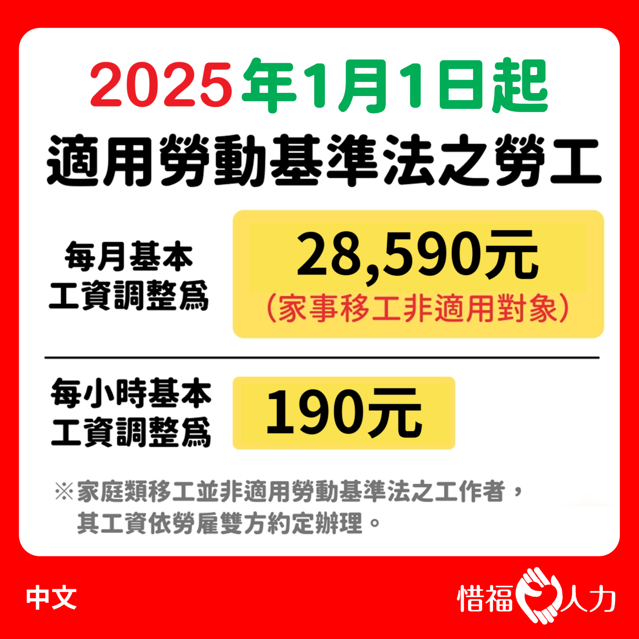 適用勞基法移工雇主注意,2025年1月1日起,最低工資實施:保障勞工基本生活的「基本工資」,將由「最低工資」取代。自明(114)年起,每月最低工資為新臺幣(以下同)2萬8,590元,每小時最低工資為190元,不適用勞基法的家事移工雇主,則依勞動契約。