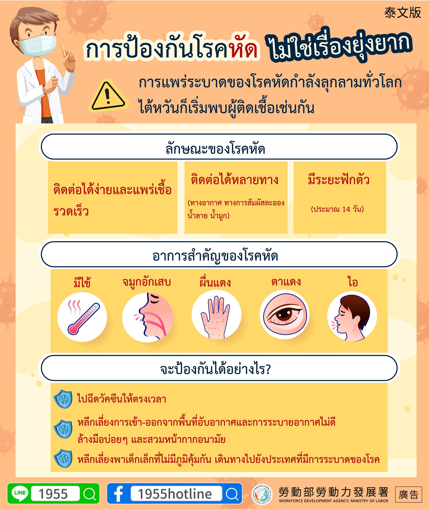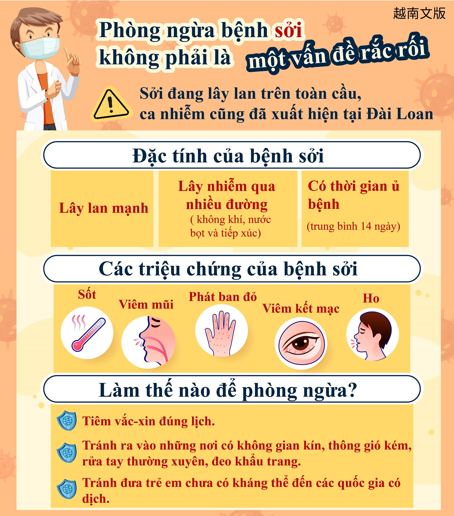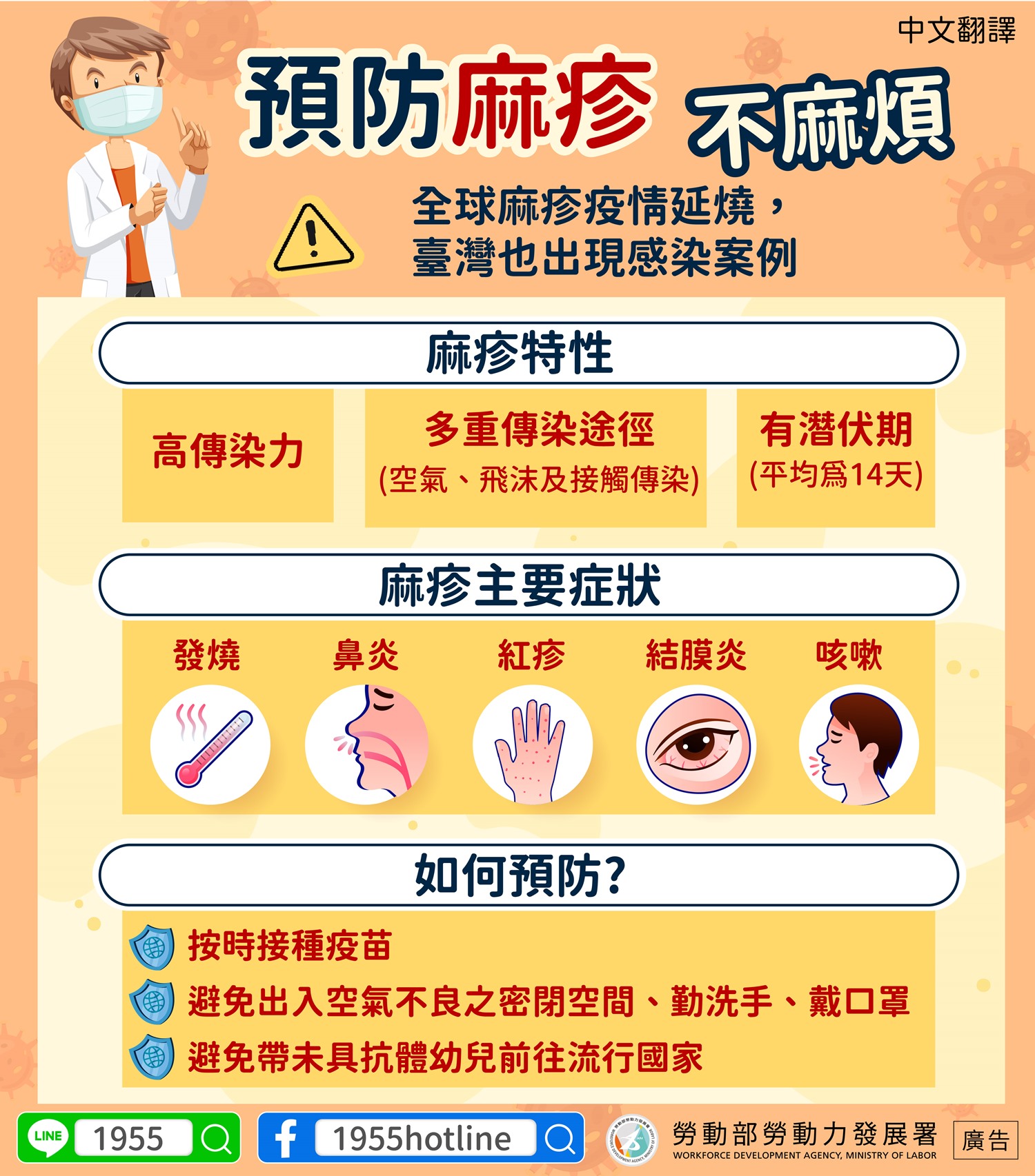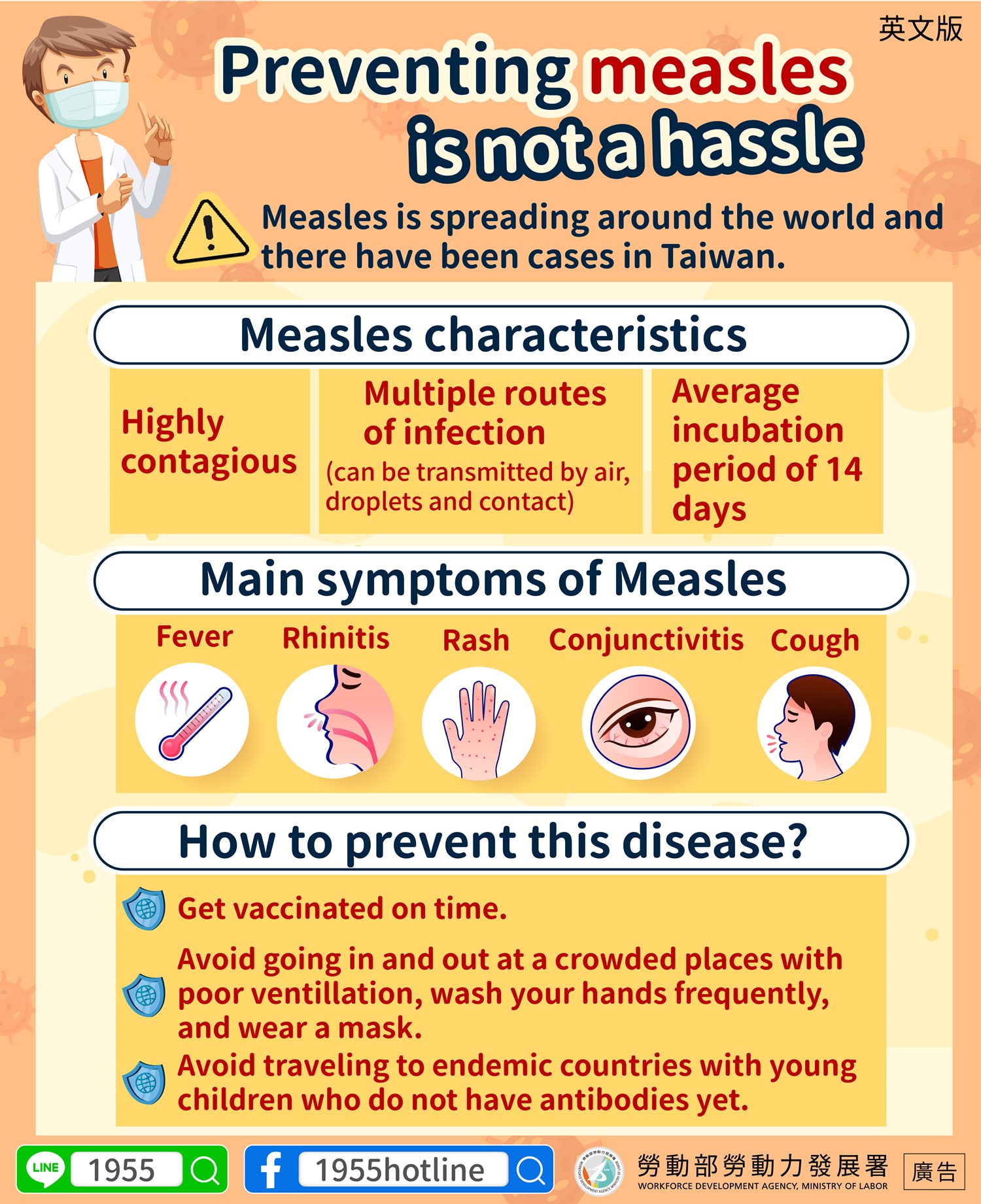 預防麻疹不麻煩!全球麻疹疫情延燒,臺灣也出現感染案例。麻疹特性:高傳染力、多重傳染途徑(空氣、飛沫及接觸傳染)、有潛伏期(平均為14天)。麻疹主要症狀:發燒、鼻炎、紅疹、結膜炎、咳嗽。如何預防?按時接種疫苗,避免出入空氣不良之密閉空間、勤洗手、戴口罩,避免帶未具抗體幼兒前往流行國家。