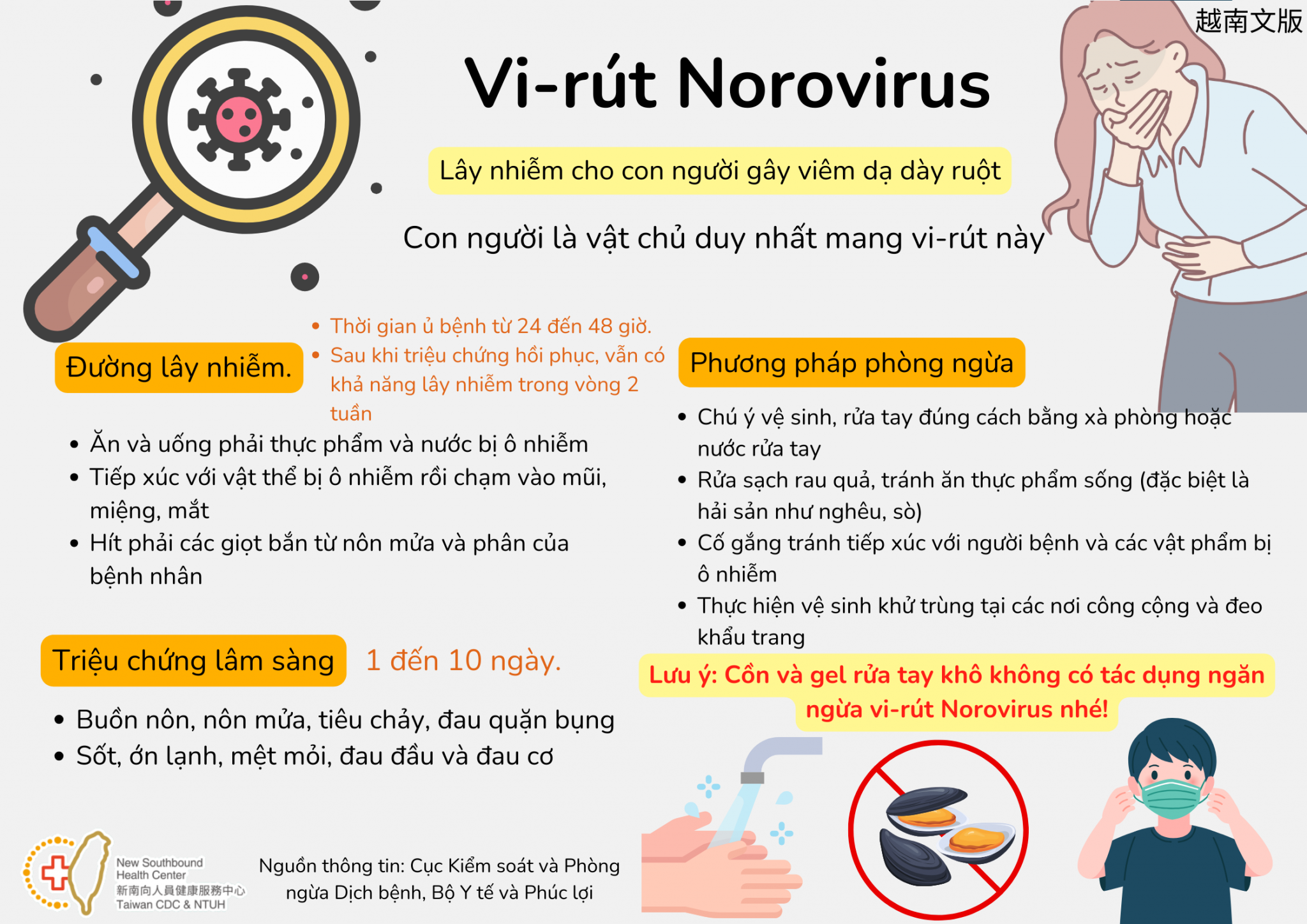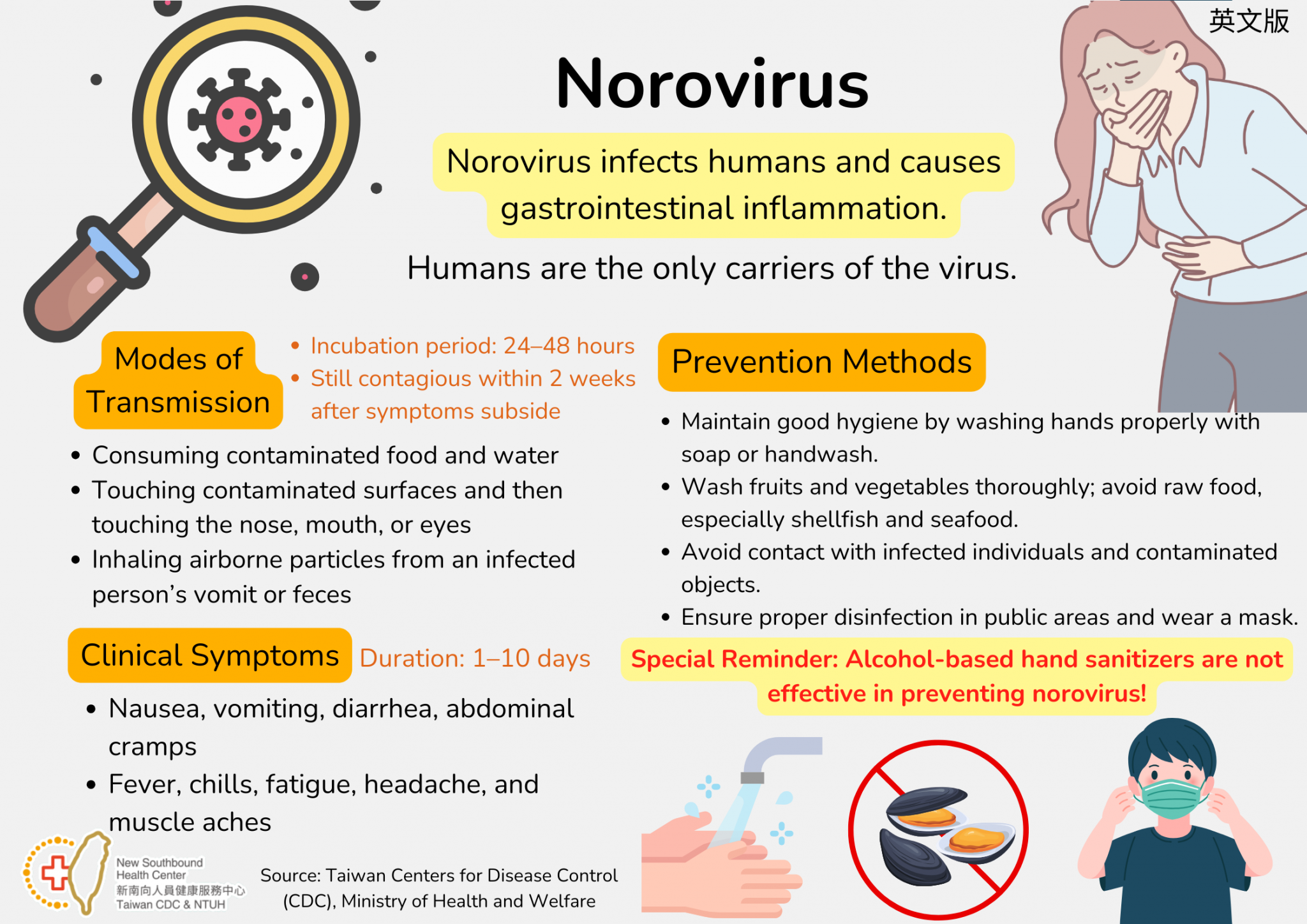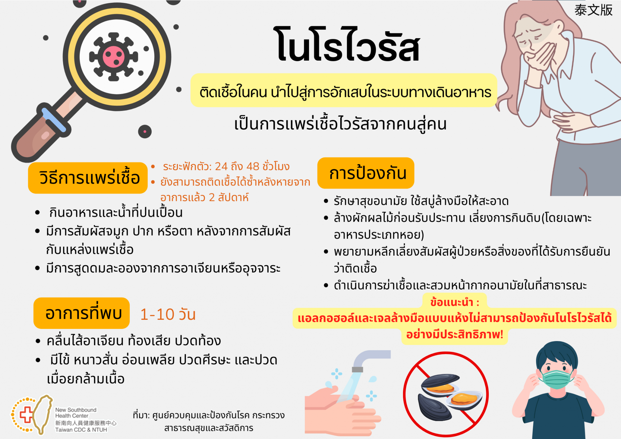 諾羅病毒預防方法,以肥皂或洗手乳正確洗手;蔬果洗淨、避免生食(尤其蚵貝類水產品);盡量避免接觸確診病患及受汙染物品;公共場所落實消毒及配戴口罩。