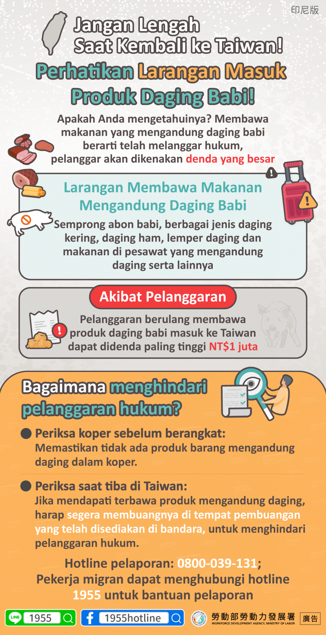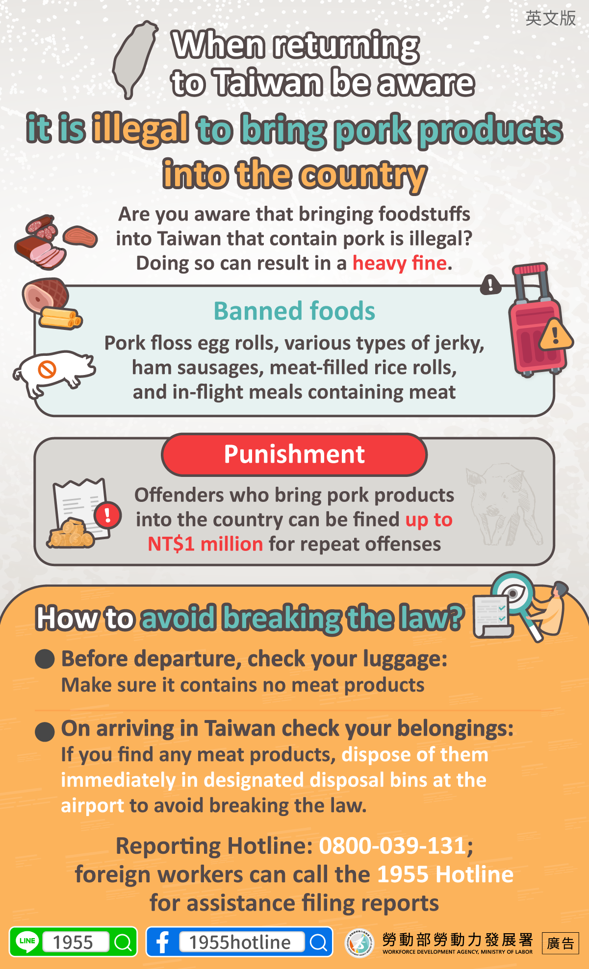 •抵達臺灣時檢查:若發現攜帶含肉產品,請立即丟棄於機場設置的棄置箱內,以免觸法
