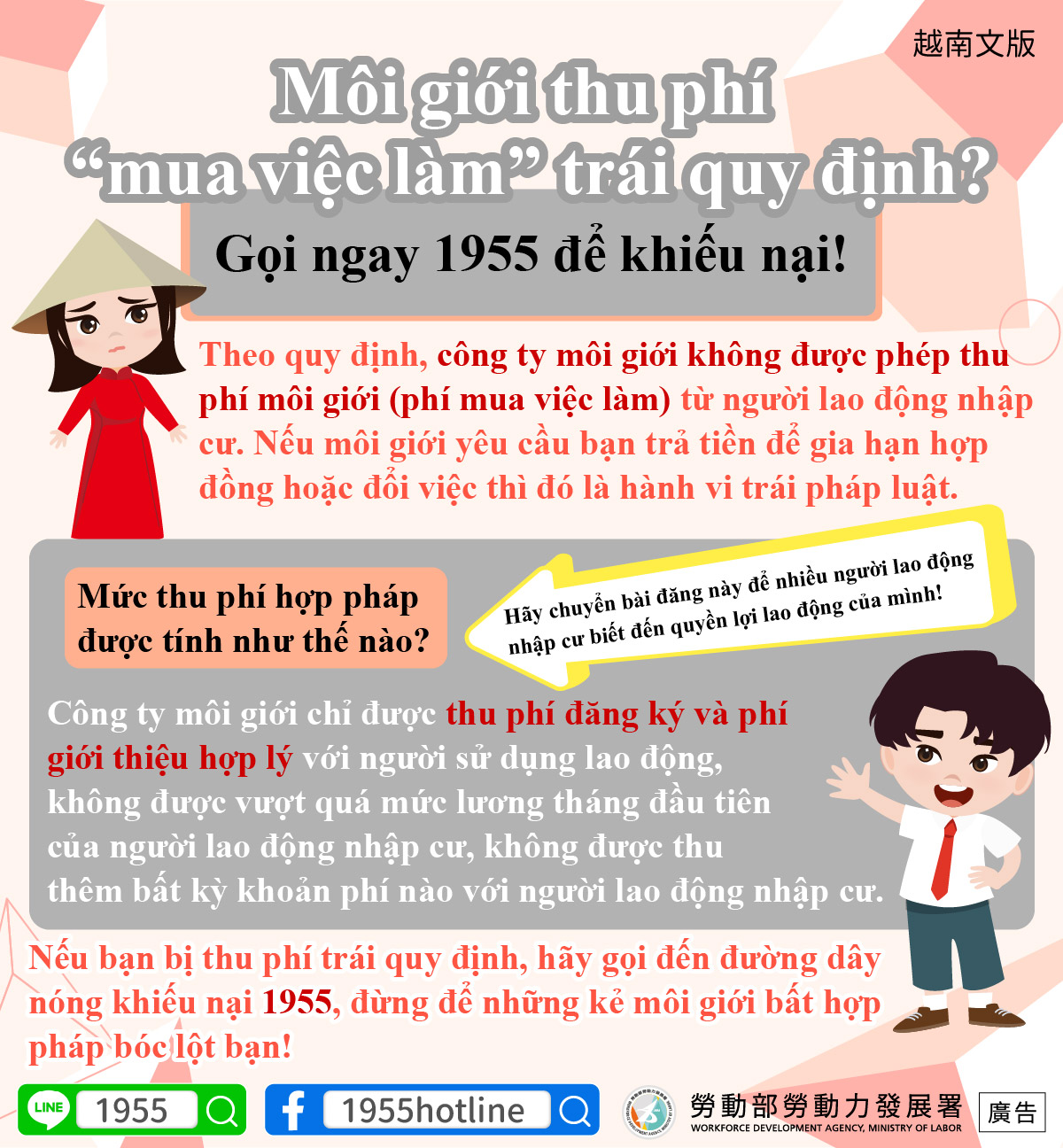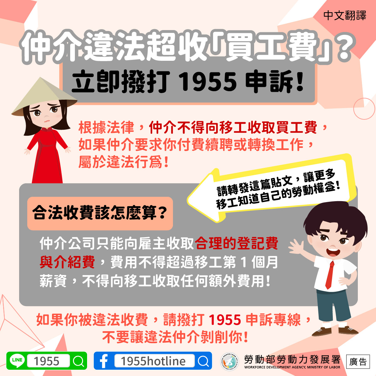 根據法律,仲介不得向移工收取買工費,如果仲介要求你付費續聘或轉換工作,屬於違法行為!