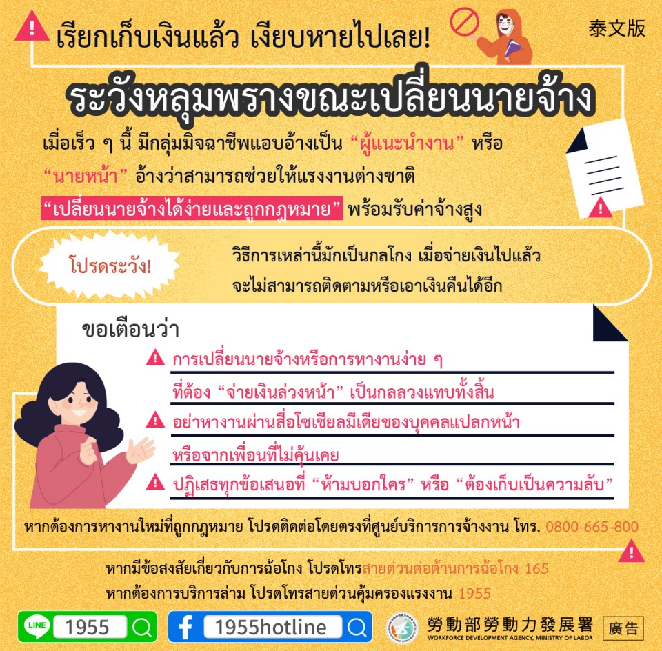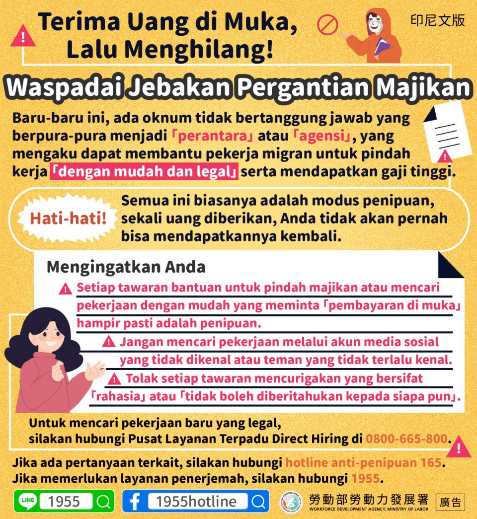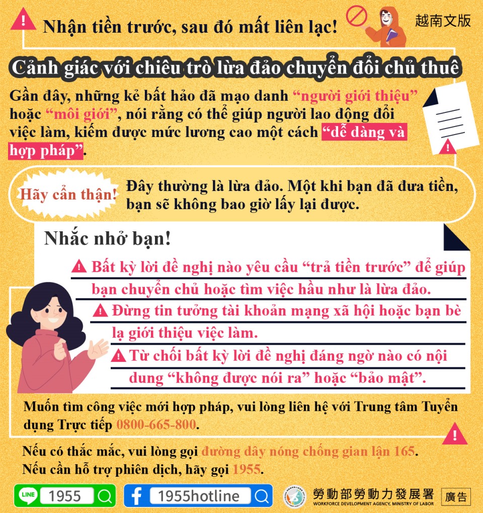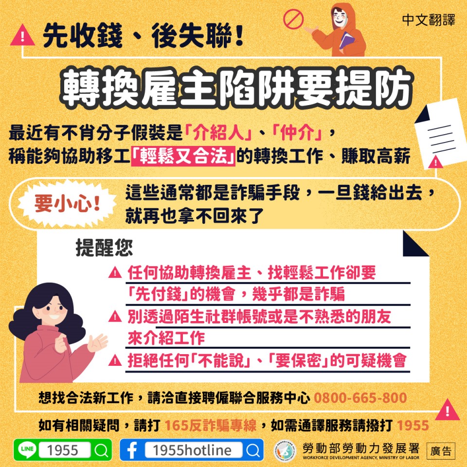 最近有不肖分子假裝是「介紹人」、「仲介」,稱能夠協助移工「輕鬆又合法」的轉換工作、賺取高薪