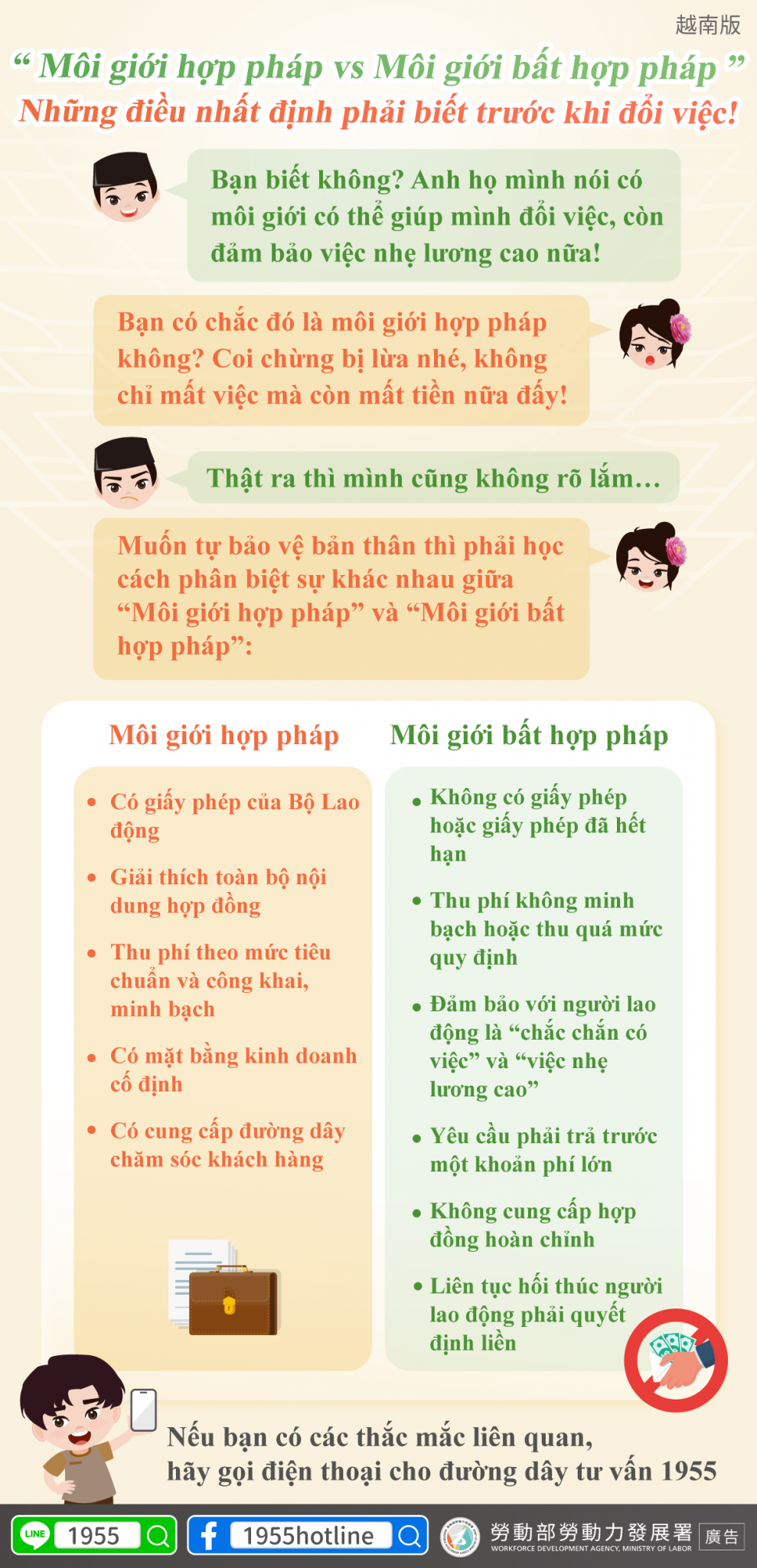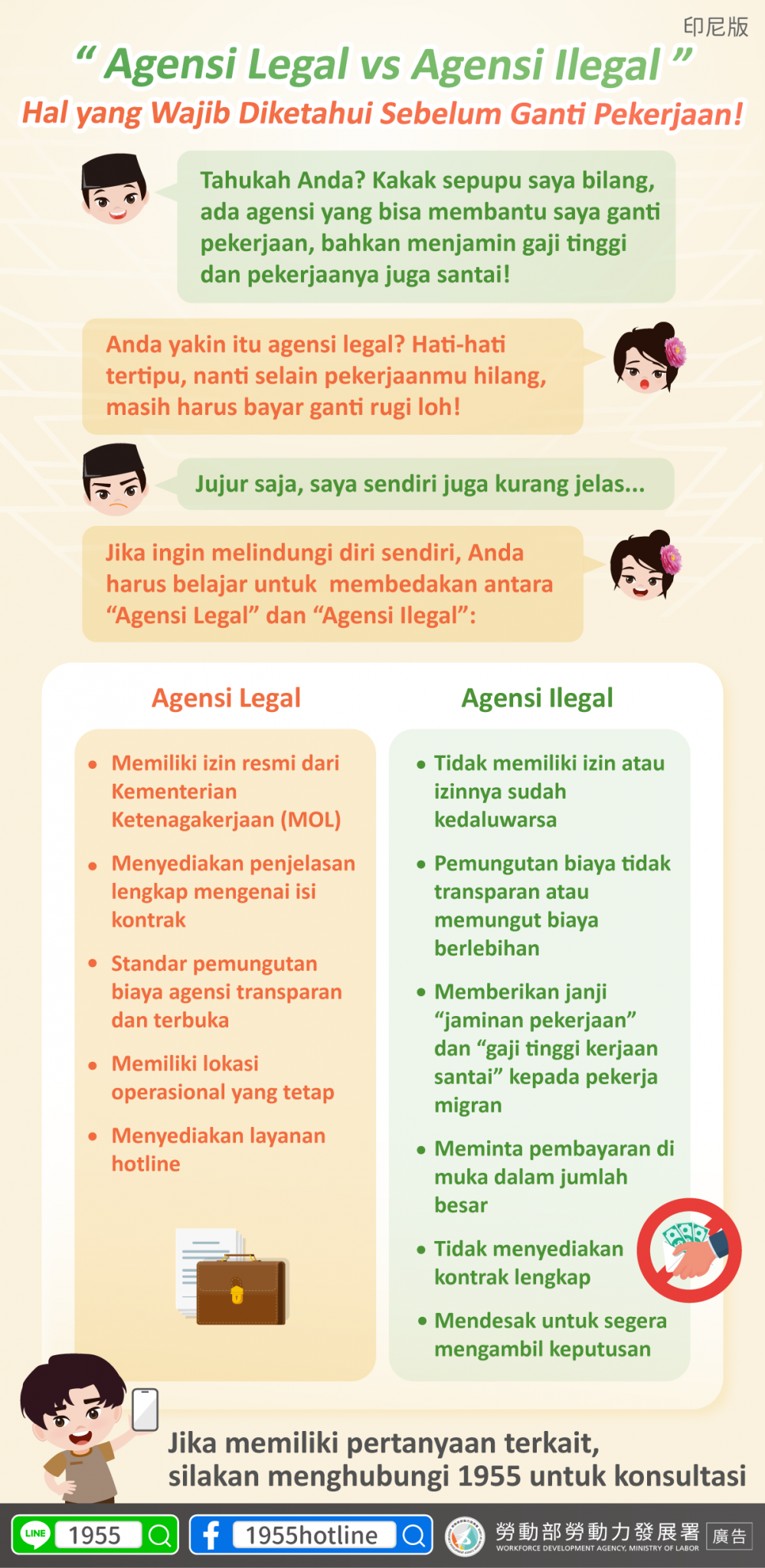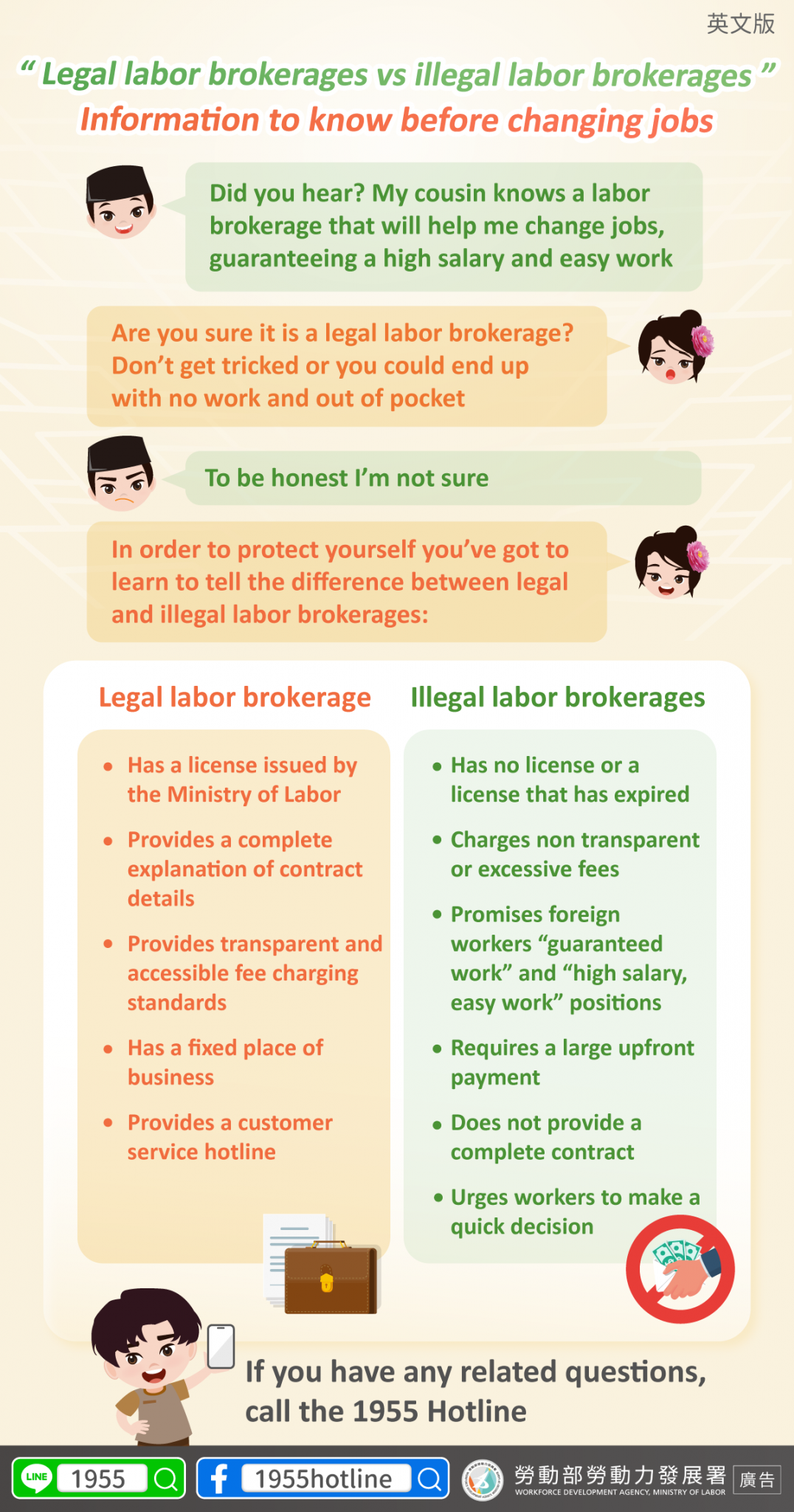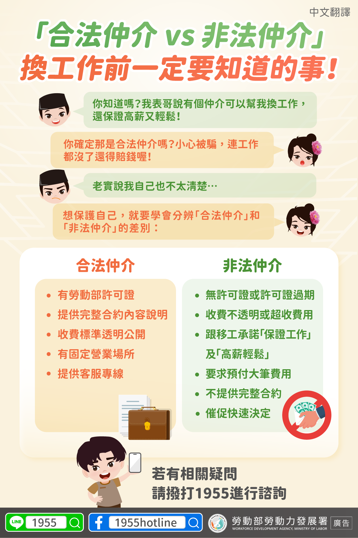 有疑問?撥打 1955,保護自己最安心!延伸閱讀 《LINE@移點通宣導:「聘請移工應透過合法仲介」》