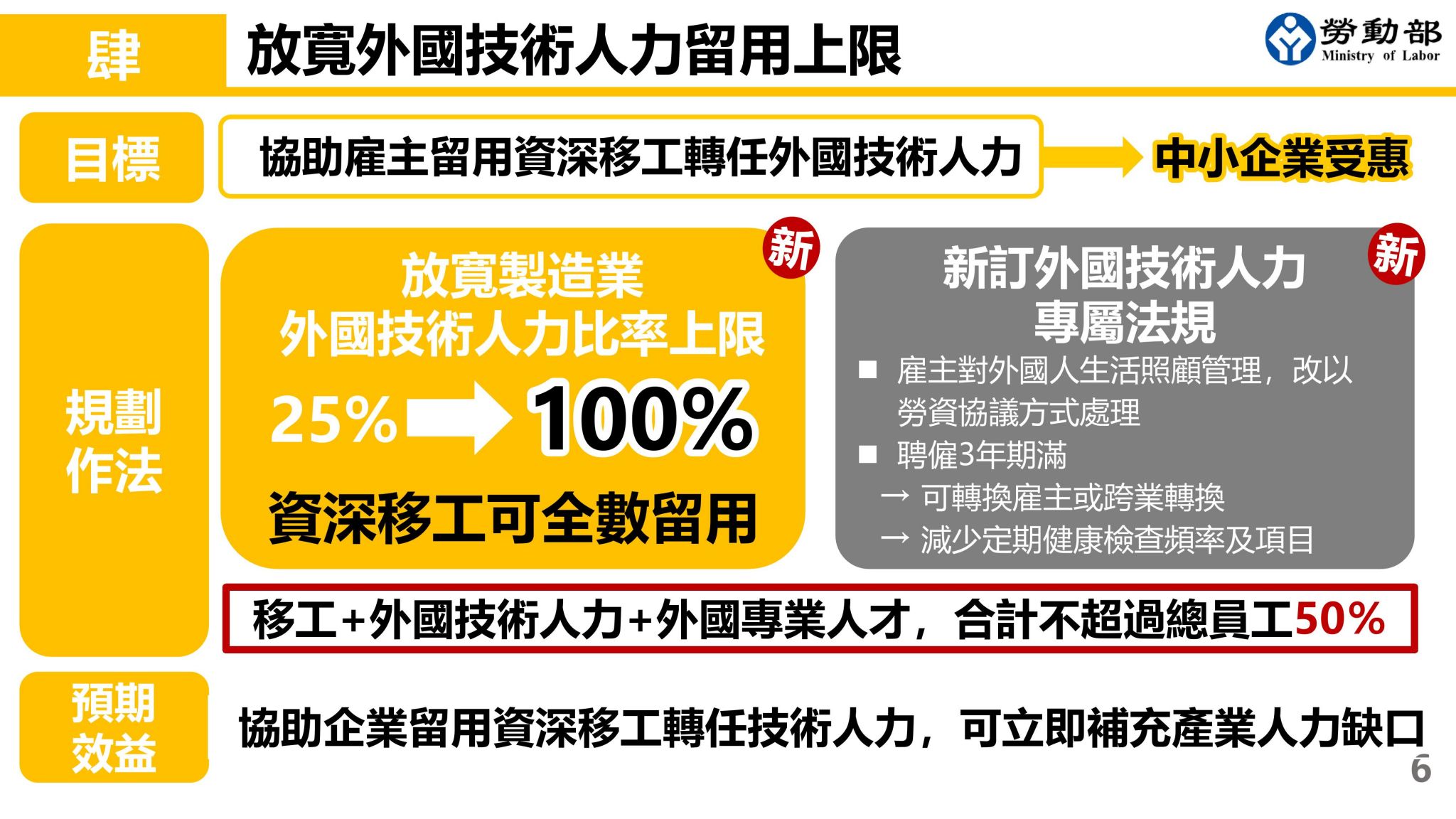 二、放寬外國技術人力留用上限:勞動部規劃開放符合轉任技術人力條件之資深移工,雇主得申請全數留用,製造業技術人力核配上限由25%放寬至100%,以協助雇主留用資深移工轉任外國技術人力,但移工、外國技術人力及外國專業人才,合計仍不得超過總員工50%;並同時鬆綁技術人力健康檢查、生活照顧管理及住宿等規範,讓外國技術人力能有更多自主生活空間,以提升勞動權益,打造多元友善的社會。