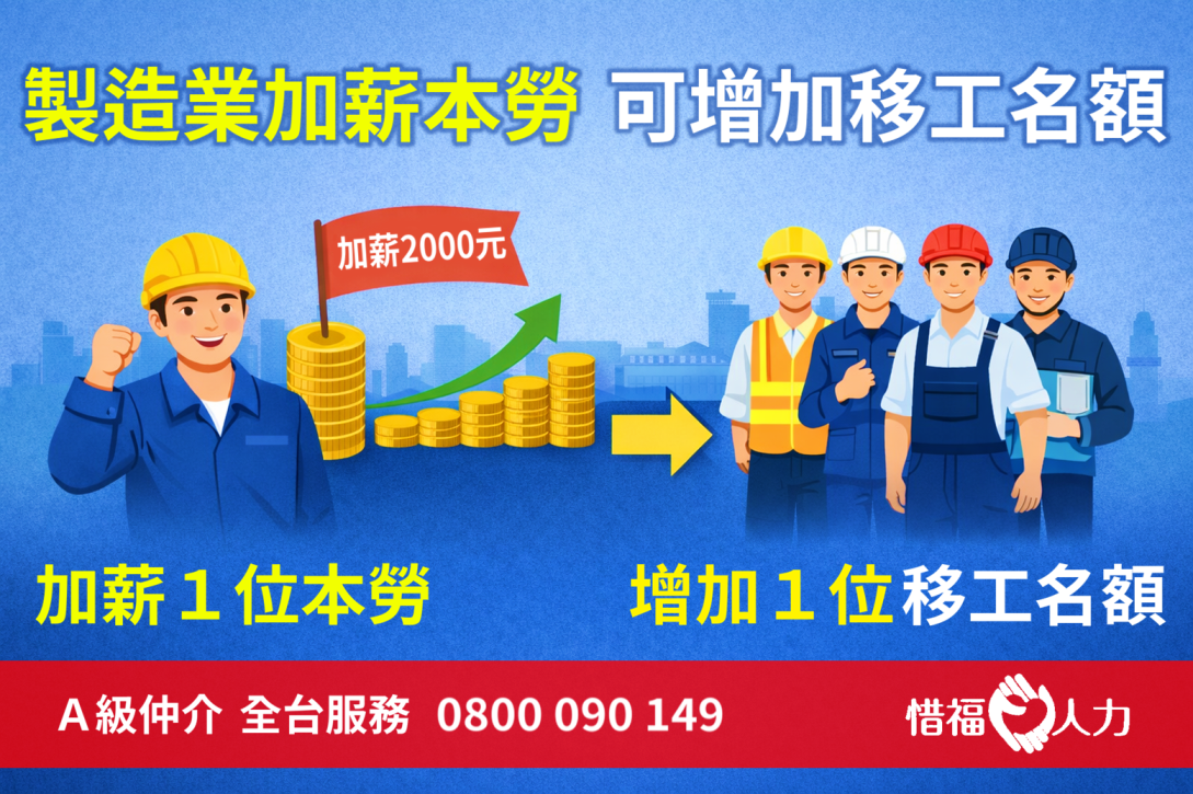 因應少子化、高齡化及產業長期缺工挑戰,勞動部自 115 年 1 月 1 日 起正式推動「跨國勞動力精進方案」。其中,針對製造業推出「加薪本勞即可增加移工名額」的新配套措施,協助企業在合法合規前提下補足人力,同時提升本國勞工薪資水準。
