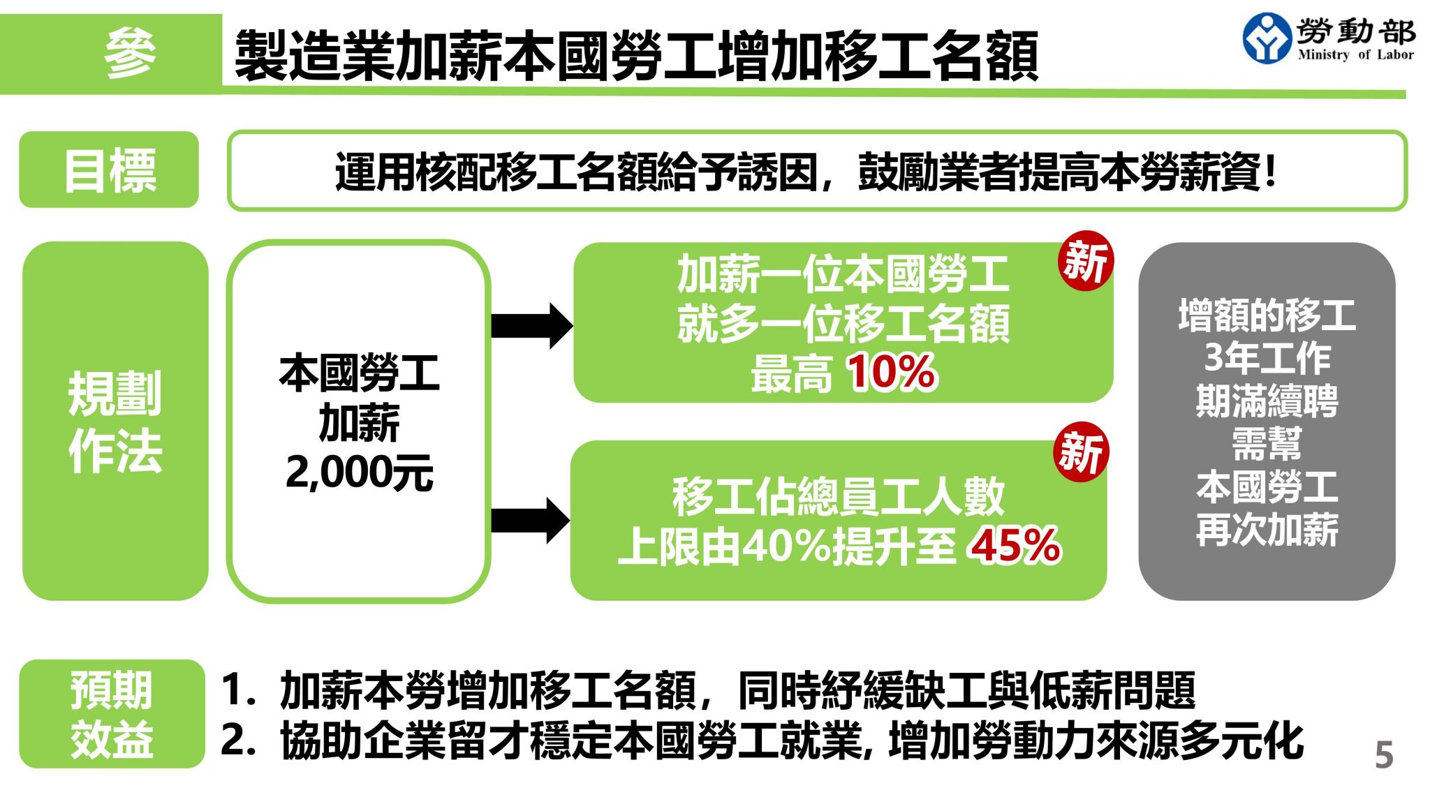 一、製造業加薪本國勞工增加移工名額:為了讓製造業補足基層人力需求,暨兼顧本國勞工薪資條件提升,勞動部規劃新增製造業移工附加名額核配機制,製造業雇主為其聘僱全時工作之本國籍勞工加薪,每加薪一位本國勞工就在3K5級制核配名額外多一位移工名額,最高不得超過其勞保投保人數10%,且採此方案之雇主,其所聘僱移工名額最高上限,由原本的勞保投保人數40%提升至45%。