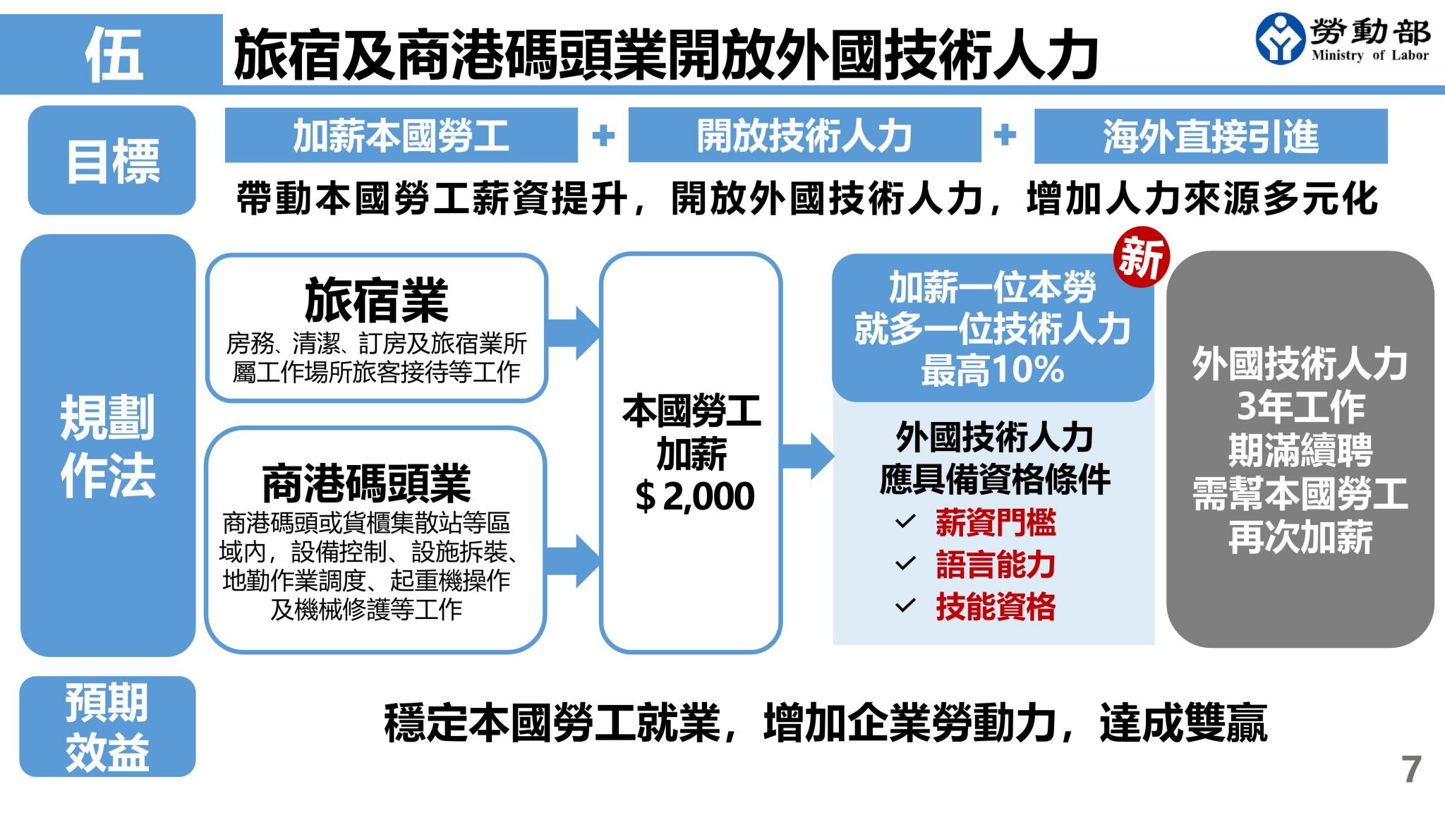 三、旅宿業及商港碼頭業引進外國技術人力:開放「旅宿服務工作」、「商港碼頭貨物裝卸集散工作」得聘僱外國技術人力且直接從海外引進,雇主為其聘僱全時本國籍工作者加薪,每加薪一位本國勞工就多一位外國技術人力名額,最高不得超過其勞保投保人數10%。.jpg)