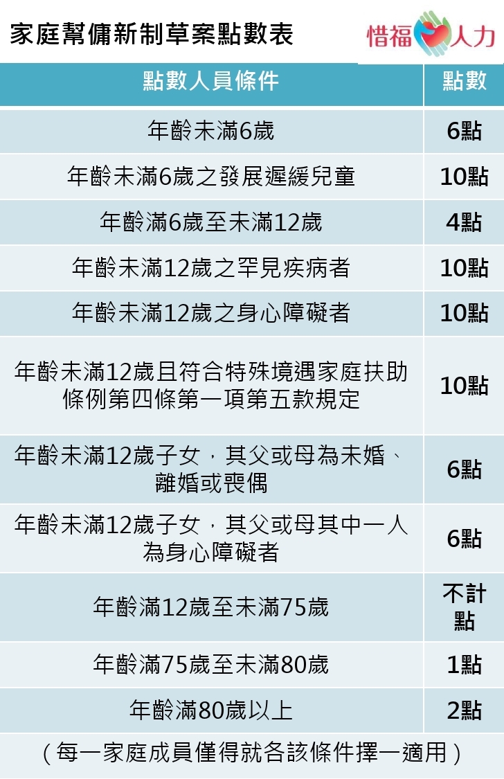 未來申請方式改為:用「家中成員條件」換算點數,累計滿4點=符合申請資格。